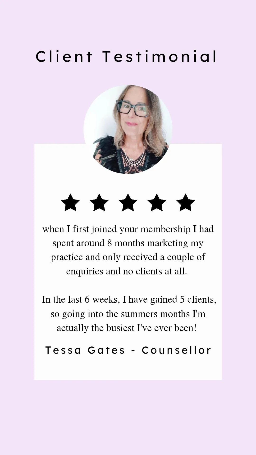 Kathy launched her website, immediately gained enquiries, then increased her session rate drastically to £150, and STILL became fully booked and continues to grow her wait list even though her profiles state she's full, and in December, because her marketing, pricing and self belief are aligned